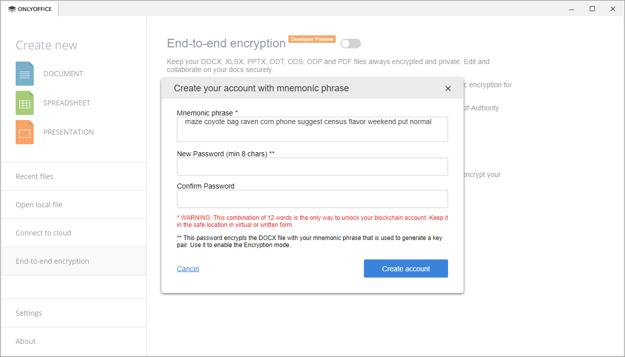 Ξεκινώντας με την έκδοση 5.2.4 για υπολογιστή (το ONLYOFFICE ειδικεύεται στην επεξεργασία κειμένου στο cloud), οι χρήστες έχουν τη δυνατότητα να δοκιμάσουν την κρυπτογράφηση από άκρο σε άκρο. Αυτή η τεχνολογία επιτρέπει την προστασία των εγγράφων (DOCX, XLSX, PPTX, ODT, ODS, ODP), συμπεριλαμβανομένων των προσωρινών αρχείων, με τον αλγόριθμο κρυπτογράφησης AES-256. Έτσι, μπορείτε να αποθηκεύσετε τα κρυπτογραφημένα έγγραφα τόσο τοπικά όσο και σε οποιαδήποτε πλατφόρμα cloud με ασφαλή τρόπο. Η τεχνολογία Blockchain με ασύμμετρη κρυπτογράφηση εφαρμόστηκε για αξιόπιστη αποθήκευση και μεταφορά κωδικού πρόσβασης.