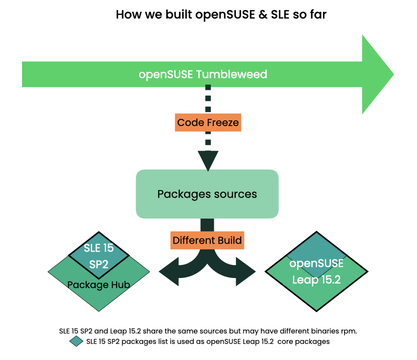 Οι αλλαγές έγιναν επειδή για ομαλότερη μετανάστευσης μεταξύ των SLE και openSUSE Leap αλλά και για μια πιο άμεση συνεργασία με την κοινότητα openSUSE. Επομένως, η SUSE διευκολύνει την κοινότητα να συνεισφέρει απευθείας στο openSUSE και το SLE μέσω νέων αποκλειστικών καναλιών. Έτσι, η κοινότητα εξακολουθεί να είναι σε θέση να διαμορφώσει και να υποβάλει αλλαγές στην επόμενη έκδοση διανομής με αυτήν το νέο τρόπο.